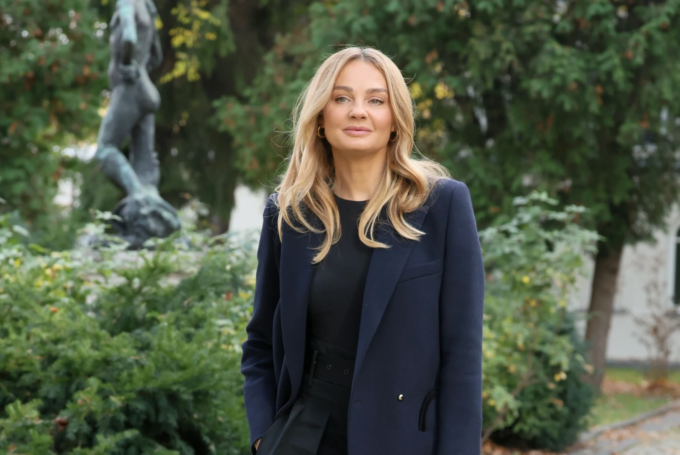Uwagę zwraca przede wszystkim granatowa, nieco dłuższa marynarka. Socha założyła ją do czarnego topu i czarnych spódnico-spodni.