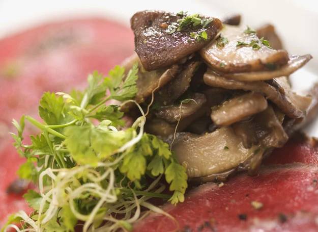 W mięsie wytnij głęboką i dość szeroką kieszeń. Od wewnątrz natrzyj mięso solą, pieprzem oraz szałwią, skrop sokiem z cytryny, następnie odłóż w chłodne miejsce na godzinę. Pieczarek nie myj, jedynie je oczyść (jeśli są mocno zabrudzone, obierz ze skórki) i podobnie jak ser żółty pokrój w drobną kosteczkę. Natkę pietruszki posiekaj jak najdrobniej. Pieczarki skrop sokiem z cytryny i podsmaż na oleju, aby odparowała z nich woda, a następnie przestudź.