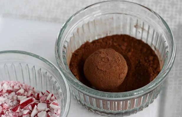 Uformowane wcześniej kupki, ponownie uformuj w dłoniach w ładne zgrabne kule. Obtaczaj w dowolnie wybranej posypce, kakao, skruszonych cukierkach, posypce. Każdą z kulek owiń kawałkiem folii plastikowej. Schładzaj, aż trufle będą gotowe.