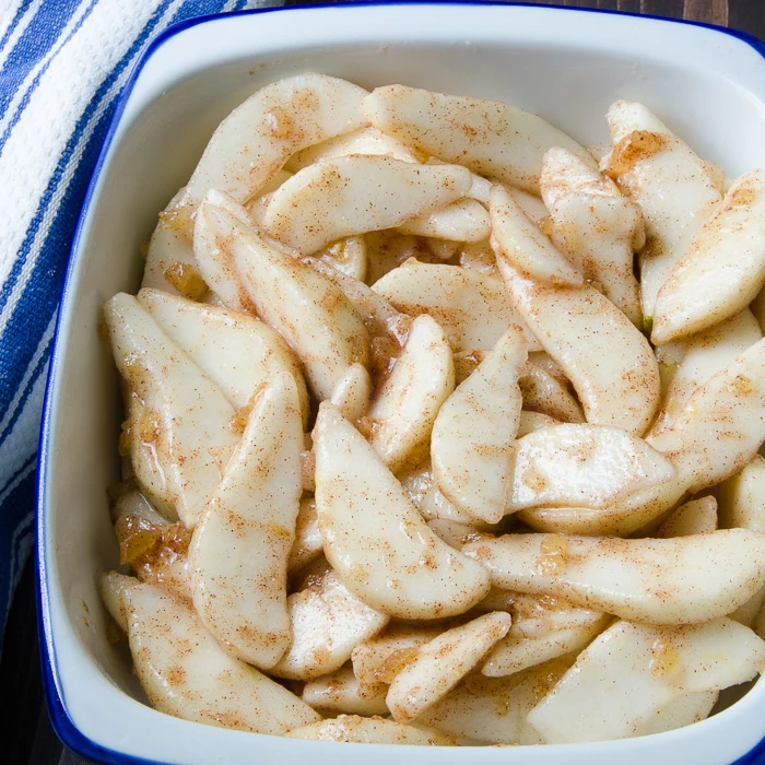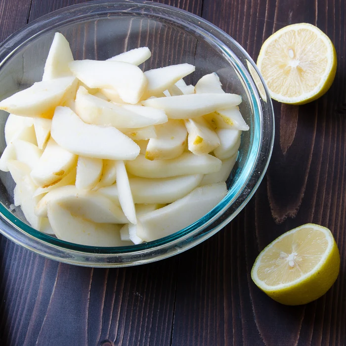 Obierz gruszki, wytnij gniazdo nasienne, potnij na ćwiartki. Skrój ćwiartki na plasterki. Przełóż gruszki do miski i skrop sokiem z cytryny. Dodaj zmielony kandyzowany imbir i zmieszaj razem. Obsyp gruszki, cynamonem i gałką muszkatołową.
