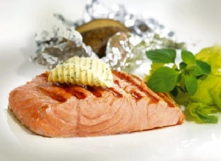 Filety z łososia posmarować oliwą, oprószyć solą i białym pieprzem. Rybę ułożyć na aluminiowej tacce. Pod koniec pieczenia na łososiu umieścić po 2 - 3 plasterki masła ziołowego. Gdy masło zacznie delikatnie się rozpuszczać, zdjąć rybę z grilla. Można podawać z pieczonymi w folii ziemniakami.