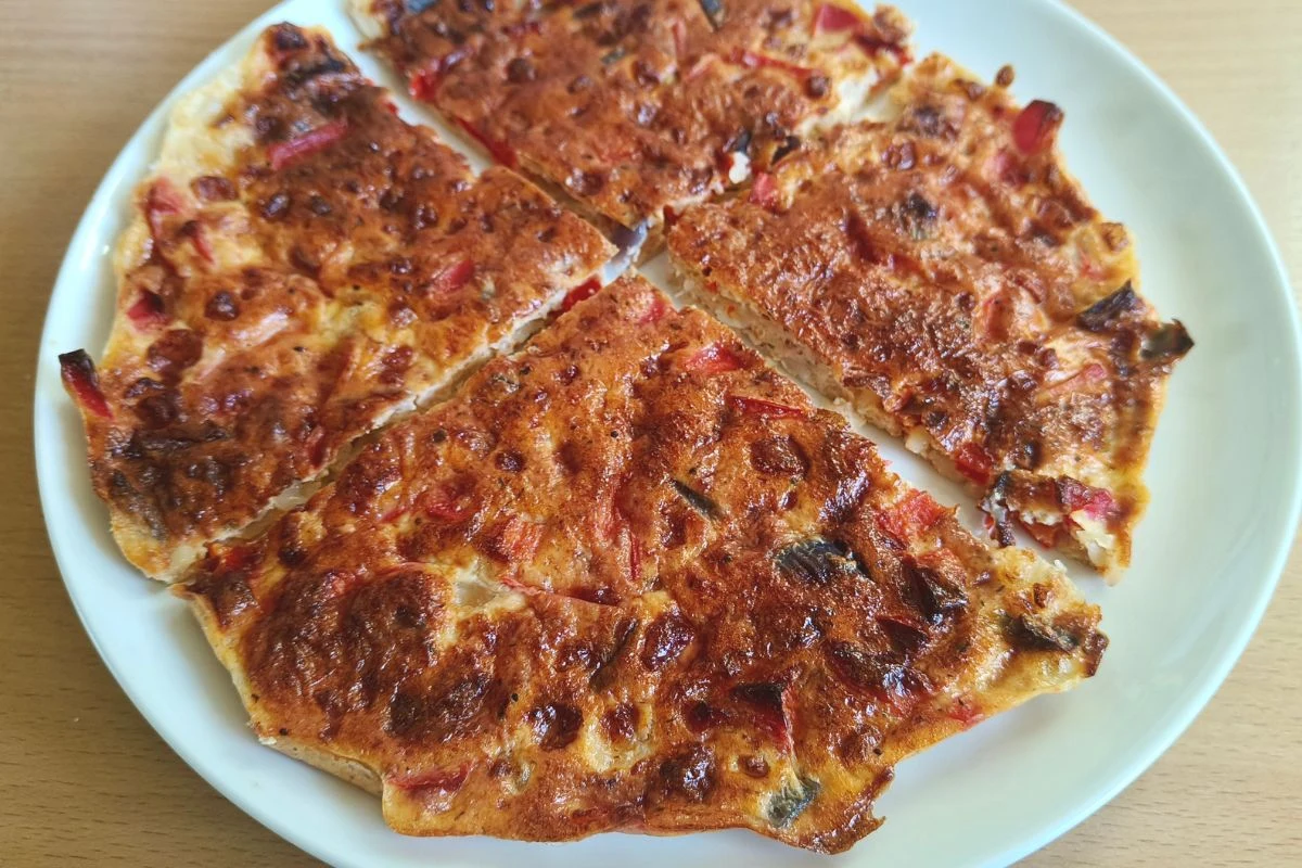 W misce mieszam jajka, serek wiejski oraz mąkę. Następnie dodaję pokrojone w drobną kostkę paprykę oraz cebulę. Dorzucam mozzarellę i przyprawy. Mieszam wszystko, aż do połączenia składników i stworzenia gęstej masy. Całość przelewam do okrągłej formy wyłożonej papierem do pieczenia. Wstawiam do piekarnika nagrzanego na 190 st. C. Czas pieczenia wynosi około 25 minut.