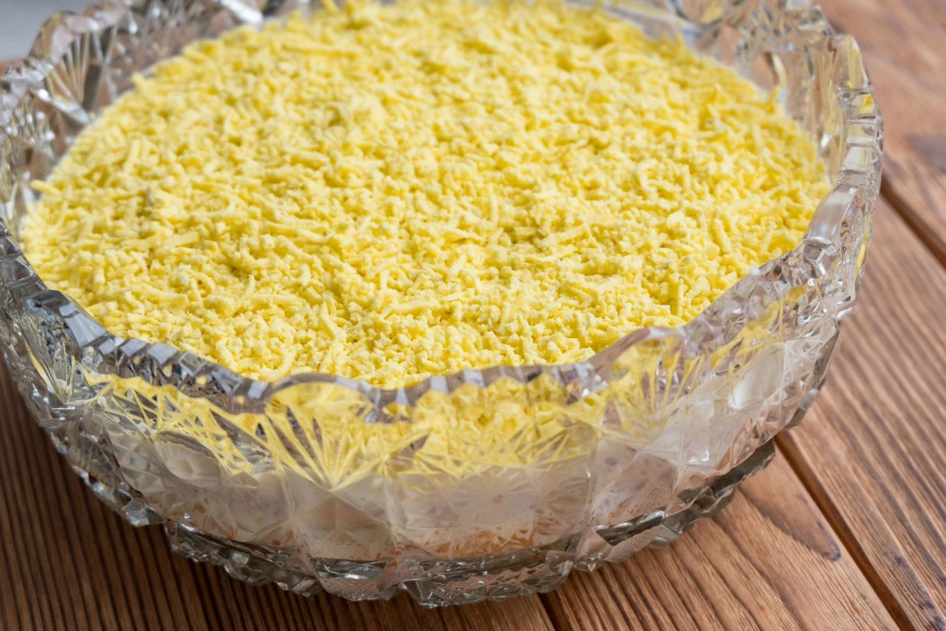 - Białka trzemy na tarce jarzynowej o dużych oczkach, a żółtka na najdrobniejszych. Oba składniki przekładamy do miski i mieszamy z jedną łyżką majonezu.