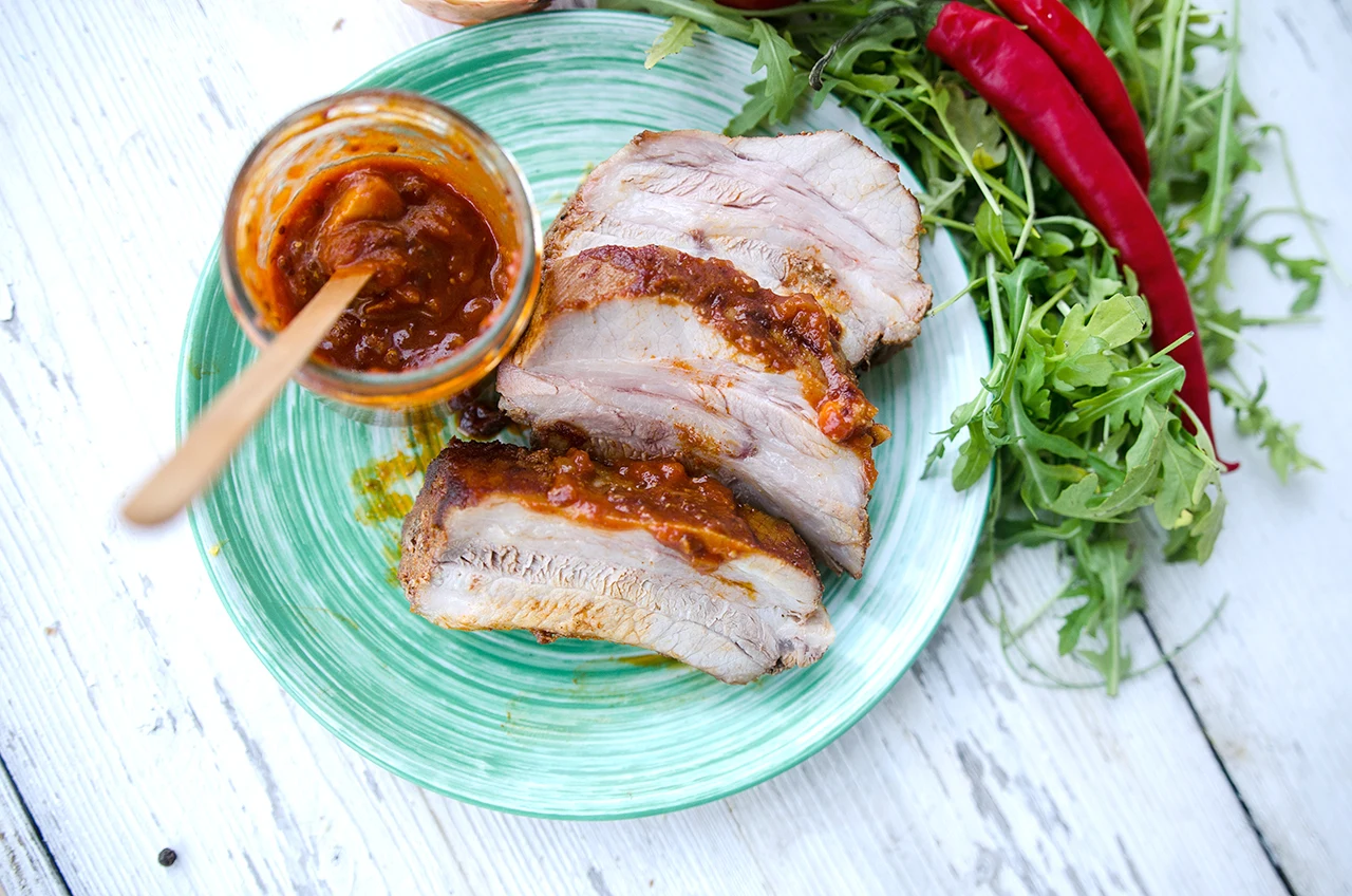 2. Zamarynowane mięso zawinąć w folię aluminiową i włożyć do nagrzanego do 160 stopni Celsjusza piekarnika na 1,5 godziny. Po tym czasie rozchylić folię mięso nasmarować sosem BBQ i piec w 200 stopniach jeszcze 10-15 minut.