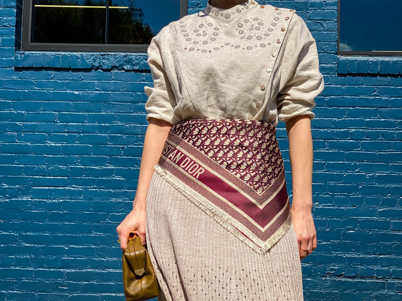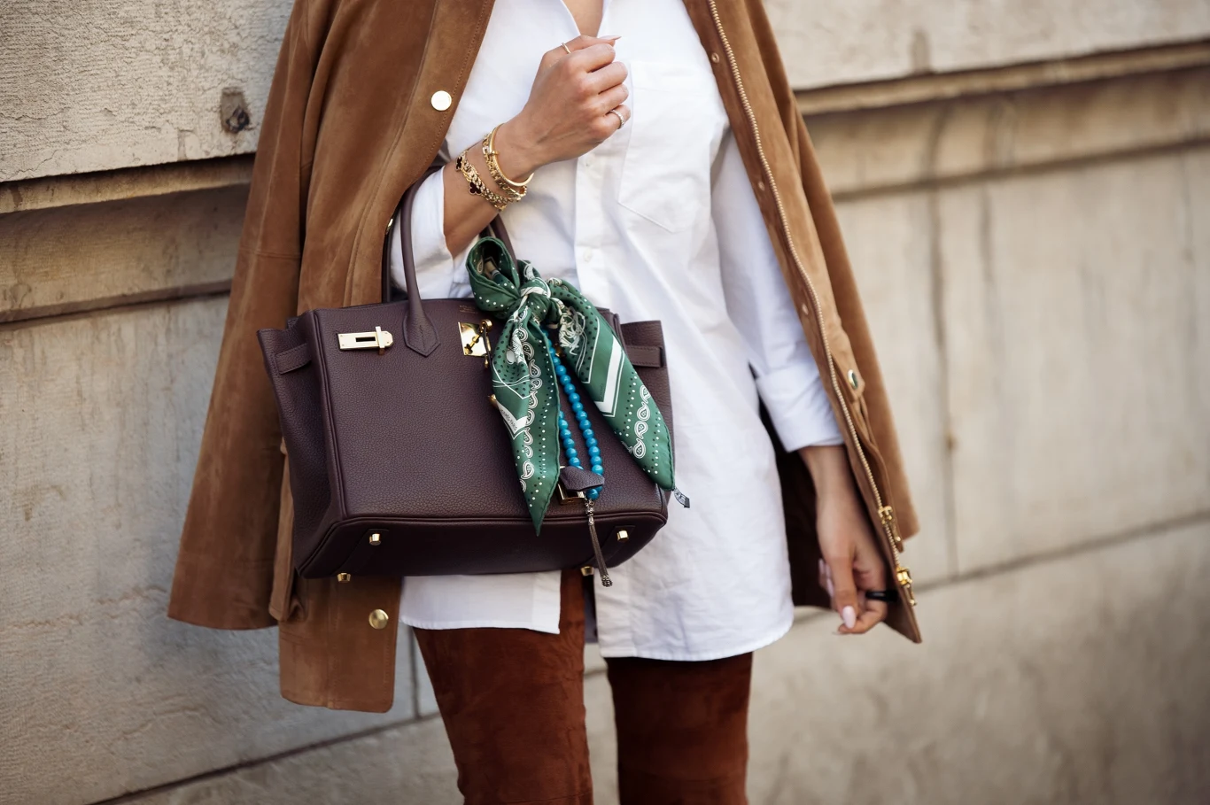 Apaszka przeszła długą drogę w modzie, ale jej prawdziwy przełom nastąpił w 1937 roku, kiedy Hermès wypuścił swoje pierwsze jedwabne carré. Na początku była po prostu eleganckim akcentem, ale szybko zyskała na popularności. W latach 50. i 60. nosiły ją niemal wszystkie kobiety - paryżanki wiązały ją pod szyją, Audrey Hepburn podkreślała nią swoje minimalistyczne stylizacje, a Grace Kelly osłaniała nią włosy, prowadząc kabriolet. Potem przyszły lata 90., a z nimi moda na prostotę, która na chwilę zepchnęła apaszkę na bok. Dziś wraca, ale w zupełnie nowym wydaniu. Już nie tylko przewiązana na szyi - teraz pojawia się na głowie, owinięta wokół rączki torebki, zamiast paska w spodniach albo nawet jakotop. Jacquemus przewiązuje nią talię swoich modelek, Gucci eksperymentuje ze wzorami, a influencerki pokazują, że można ją nosić na dziesiątki sposobów.