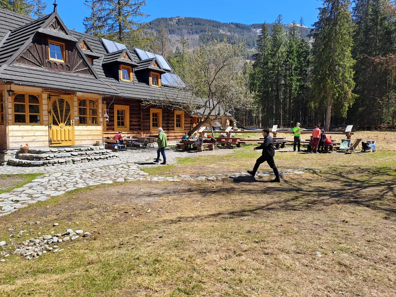 Zaledwie kilkunastominutowy spacer dzieli zatłoczony asfaltowy szlak i bajeczną polanę. Idąc pierwszy raz w dół, po kamiennych schodach, takiego widoku się nie spodziewałam. Skąpana w słońcu polana z drewnianym, uroczym schroniskiem, od razu skradła moje serce. Zaledwie chwilę temu otaczał mnie tłum turystów a chwilę później zaledwie kilku. Rozpostarci na leżakach, rozkoszowali się ciszą i spokojem. I pysznym jedzeniem. Bo to schronisko słynie z nieziemskiej, domowej kuchni. Legenda głosi, że kto choć raz spróbuje zupy borowikowej lub czosnkowej już nigdy nie zje lepszej. Nie można zapominać o tatrzańskim klasyku, szarlotce, ponoć najlepszej w polskich Tatrach!