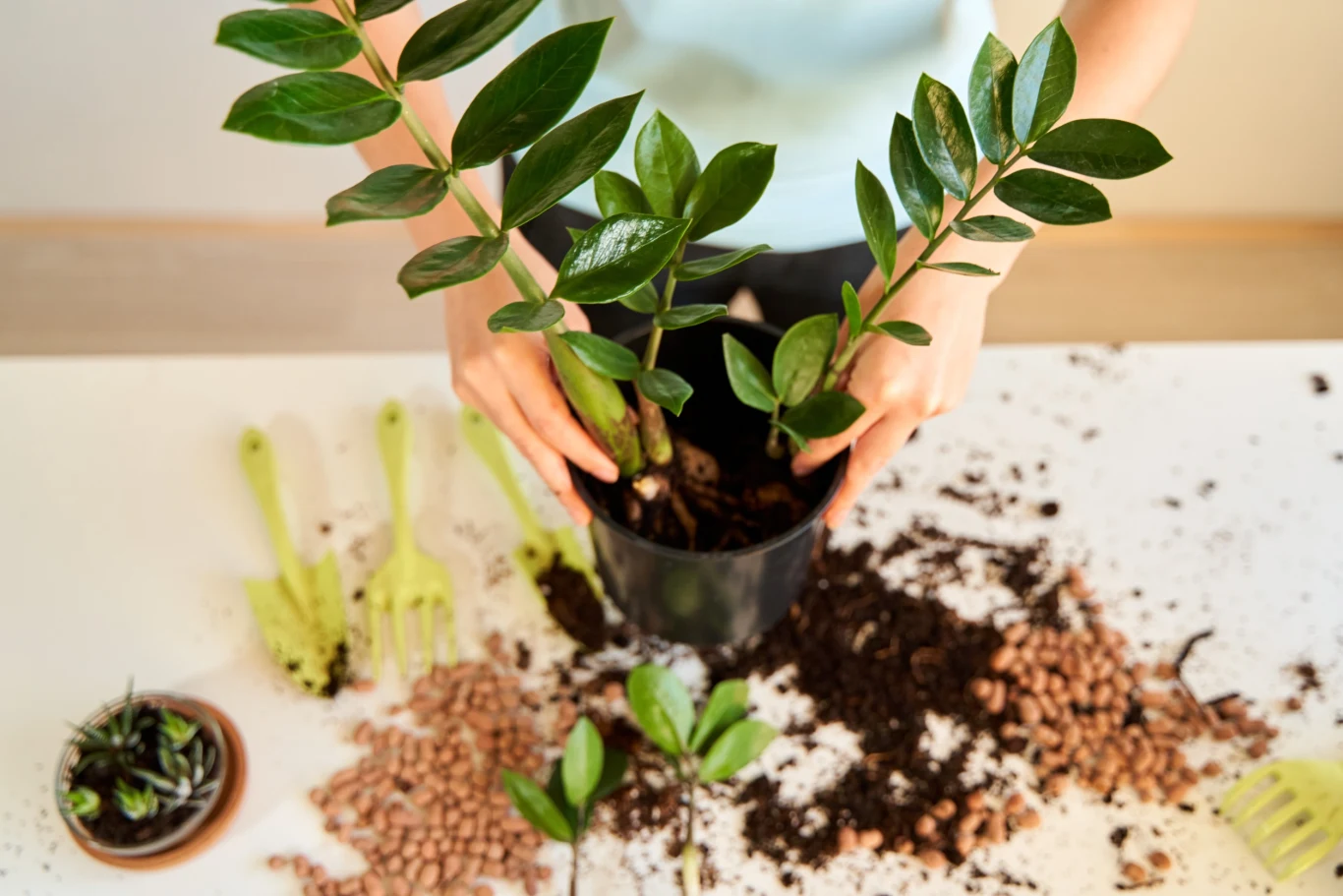 Gdy zauważysz, że korzenie zaczynają rozsadzać doniczkę, wzrost rośliny jest zahamowany lub liście zaczęły żółknąć, są to sygnały, że zamiokulkas potrzebuje przesadzenia. Najczęściej wykonuje się je wiosną (w marcu oraz w kwietniu) i jest to najlepsza okazja to przeprowadzenia rozmnażania przez podział kłącza. Jak się za to zabrać?