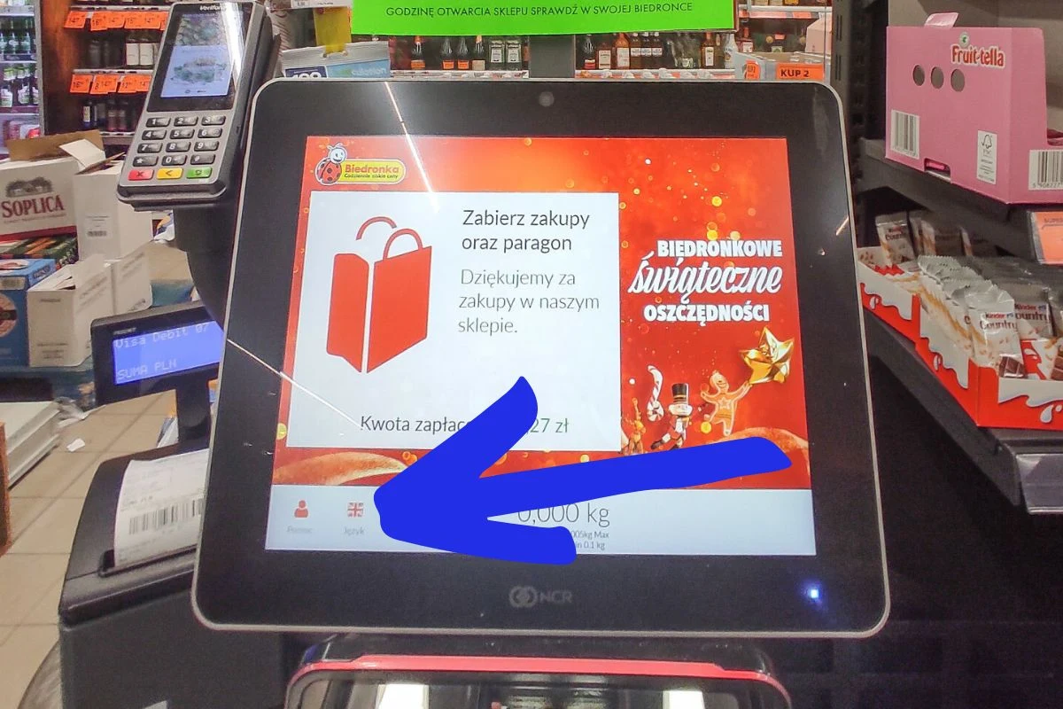 Jednak to rozwiązanie ma także swoje minusy: należy liczyć się także z tym, że wszystkie napisy, takie jak: “Płacę", czy “Wyszukaj po nazwie lub wprowadź kod" zostaną przetłumaczone na angielski. Dla osób znający ten język nie będzie to przeszkodą, podobnie dla tych, którzy obsługę kas w Biedronce znają na pamięć. Można też zrobić zakupy z panelem w języku polskim, a tuż przed pakowaniem zmienić go na angielski — ta metoda z pewnością spodoba się tym z nas, którzy czują presję czasu nieustannie poganiani przez głos lektorki.