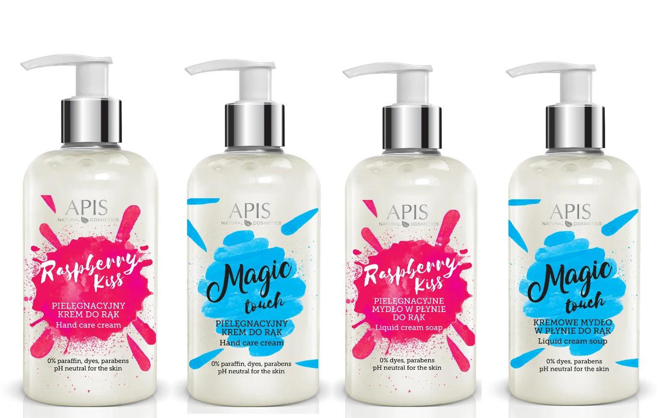 Produkty do pielęgnacji dłoni od firmy APIS dostępne są w 2 wariantach zapachowych - RASPBERRY KISS oraz MAGIC TOUCH. Oprócz właściwości odżywczych mają intensywny, piękny, zmysłowy zapach, który utrzymuje się na skórze przez cały dzień. Co więcej, oba kosmetyki mają praktyczne opakowanie z pompką, która ułatwia dozowanie mydła i aplikację kremu.