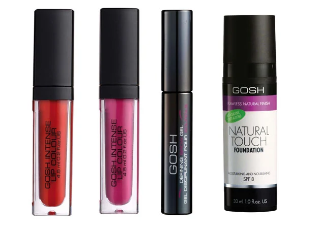Nowe kosmetyki kolorowe marki Gosh idealnie wpisują się w najświeższe trendy w makijażu. Ich stonowane, delikatne odcienie brązu, brzoskwini i beżu, nawiązujące do stylu "Nude" subtelnie eksponują naturalne piękno. Wyjątkową propozycję stanowi: lekki naturalny podkład organiczny Gosh Natural Touch Fundation, paleta matowych cieni do brwi Gosh Defining Brow Kit, żel do brwi i rzęs Gosh Defining Brow Gel, pomadka w płynie Gosh Intense LipColour oraz lakier do paznokci w trzech supermodnych kolorach Miss Sweety, Miss Mole, Miss Minty.