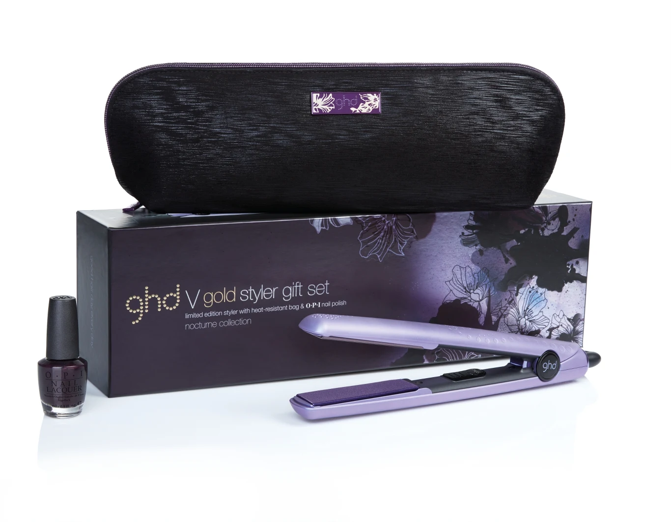 W zestawie: prostownica z limitowanej serii ghd platinium, futerał odporny na wysoką temperaturę oraz dwa lakiery do paznokci marki OPI.