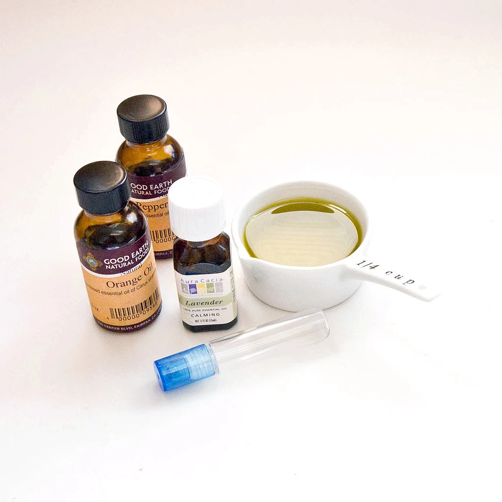 Wystarczy odmierzyć oliwę z oliwek i dodać parę kropli olejów eterycznych. Oliwa z oliwek świetnie przenosi zapach olejków oraz zawiera witaminę E, która wygładza skórę. Mięta pieprzowa łagodzi bóle głowy. Lawenda uspokaja. Natomiast pomarańcza uwalnia od napięć i łagodzi stres.