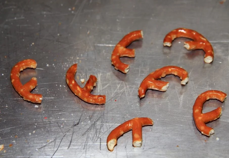 Przygotuj linię produkcyjną. Przełam precelki na pół. Potrzebujesz dwóch połówek na rogi jednego renifera. Na szczycie pianki zrobiłam dwie dziurki, mam nadzieję, że poroże renifera będzie się lepiej trzymać. Nabite pianki na patyczki umocuj w gąbce.