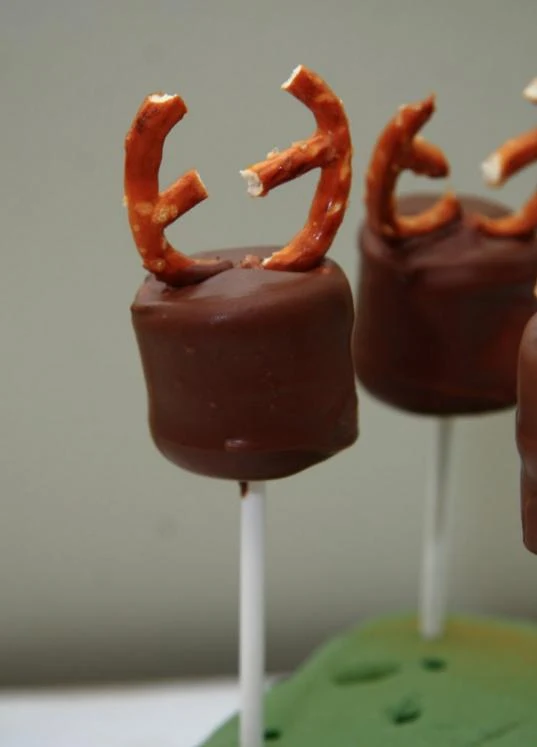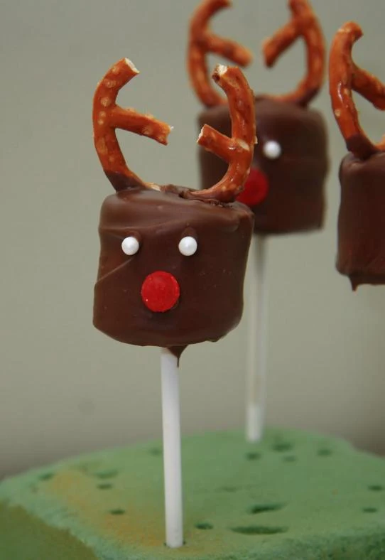Po paru zamoczonych piankach, czas na poroże renifera. Wsuń precelki w piankę i przytrzymaj chwilę by czekolada zastygła.