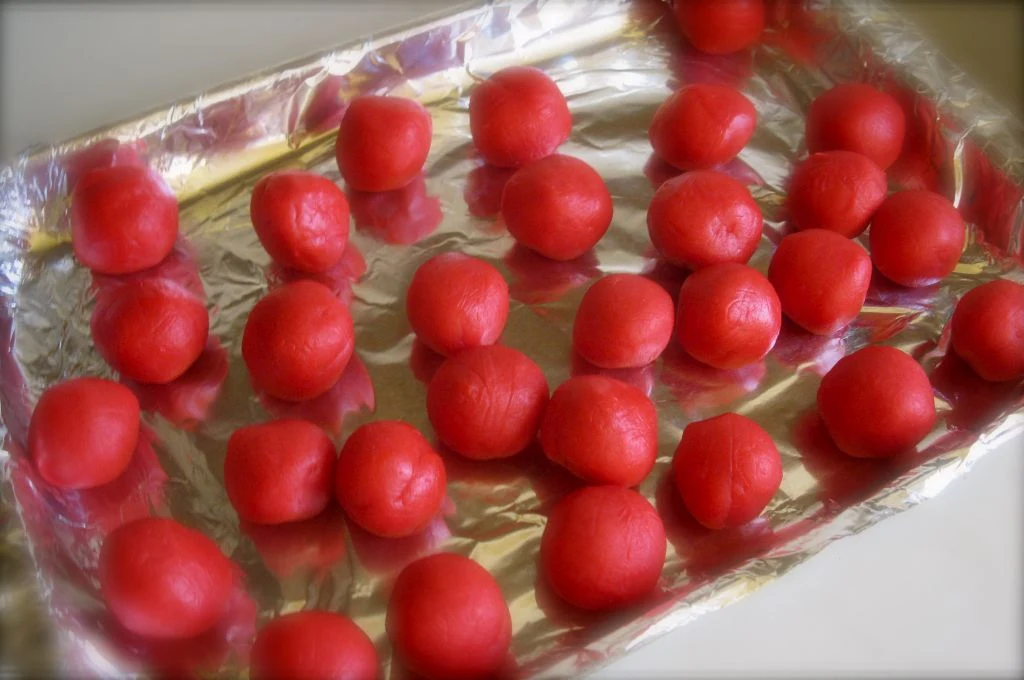 Z ciasta uformuj kule o średnicy około 3 cm i wstaw do lodówki na godzinę. Blaszkę po pieczenia wyłóż pergaminem.