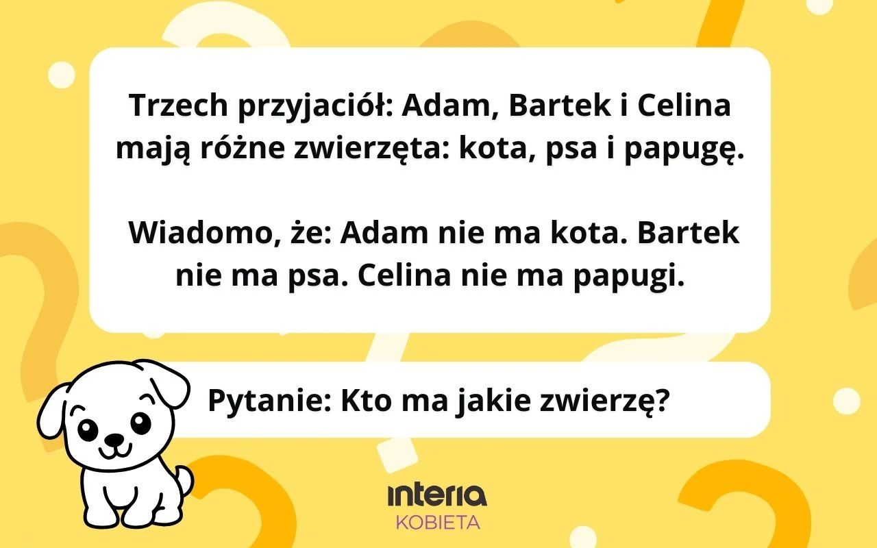 Jedna z możliwych odpowiedzi to: Adam ma papugę, Bartek ma kota, a Celina ma psa. A tobie jakie wyszło rozwiązanie?