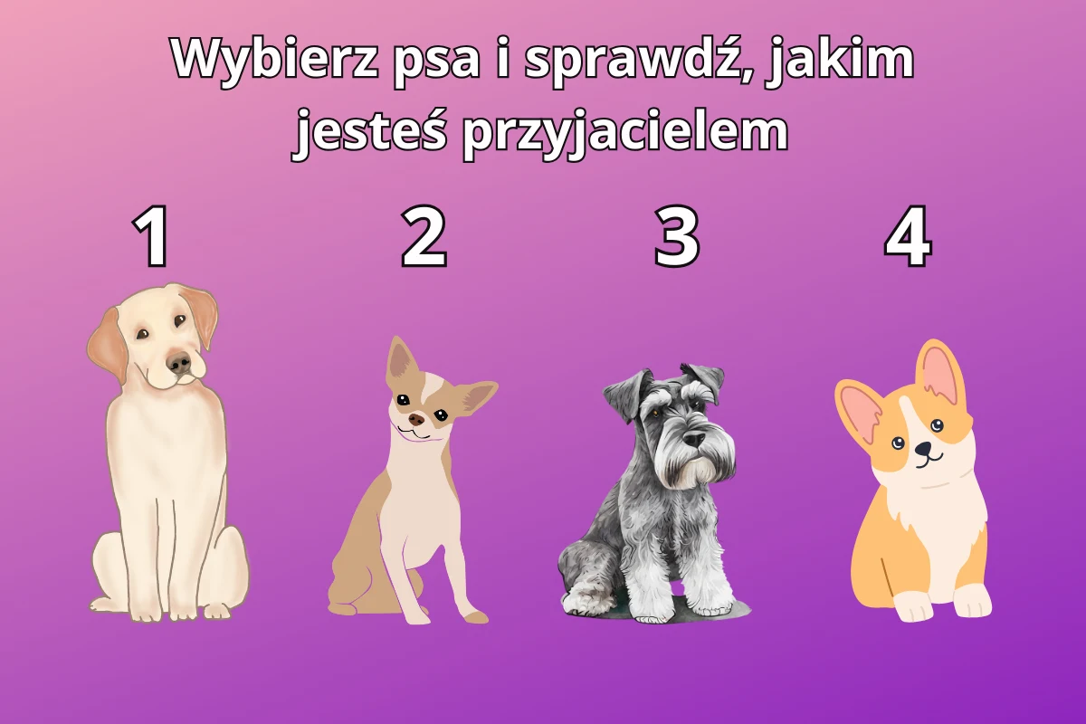 Czasem nieoczywiste wybory, potrafią wiele zdradzić na nasz temat. Nawet to, jaka rasa psów nam się podoba. Obrazek przedstawia cztery możliwości, a każdy z nich reprezentuje inne cechy i wartości. Sprawdź, jakim jesteś typem przyjaciela. Powodzenia!