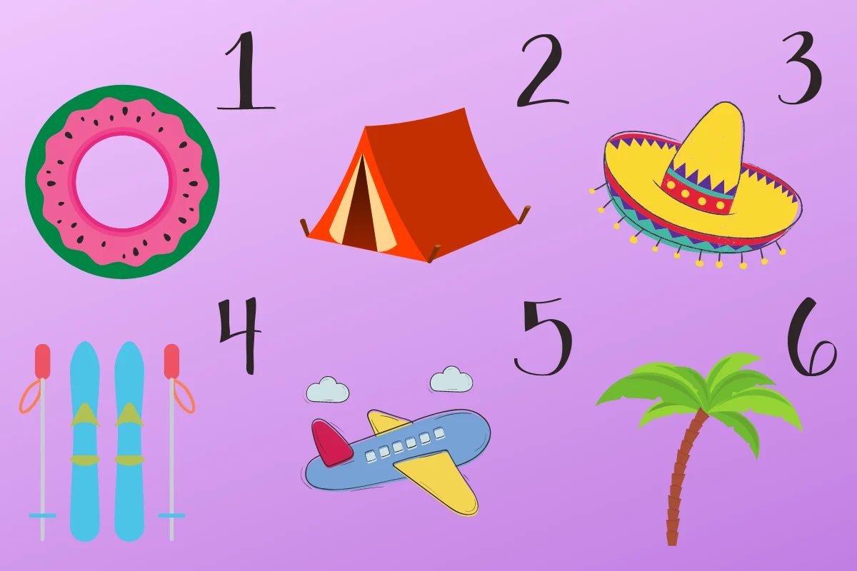 Na obrazku widnieje sześć przedmiotów, które bywają używane podczas wakacji. Każdy z nich jest wyjątkowy i symbolizuje liczne cechy osobowości. Nie bez powodu się nimi otaczamy. Wybierz jedną rzecz, która jako pierwsza przypadła ci do gustu i sprawdź, co to oznacza. Z tego testu dowiesz się, jakim jesteś typem urlopowicza.